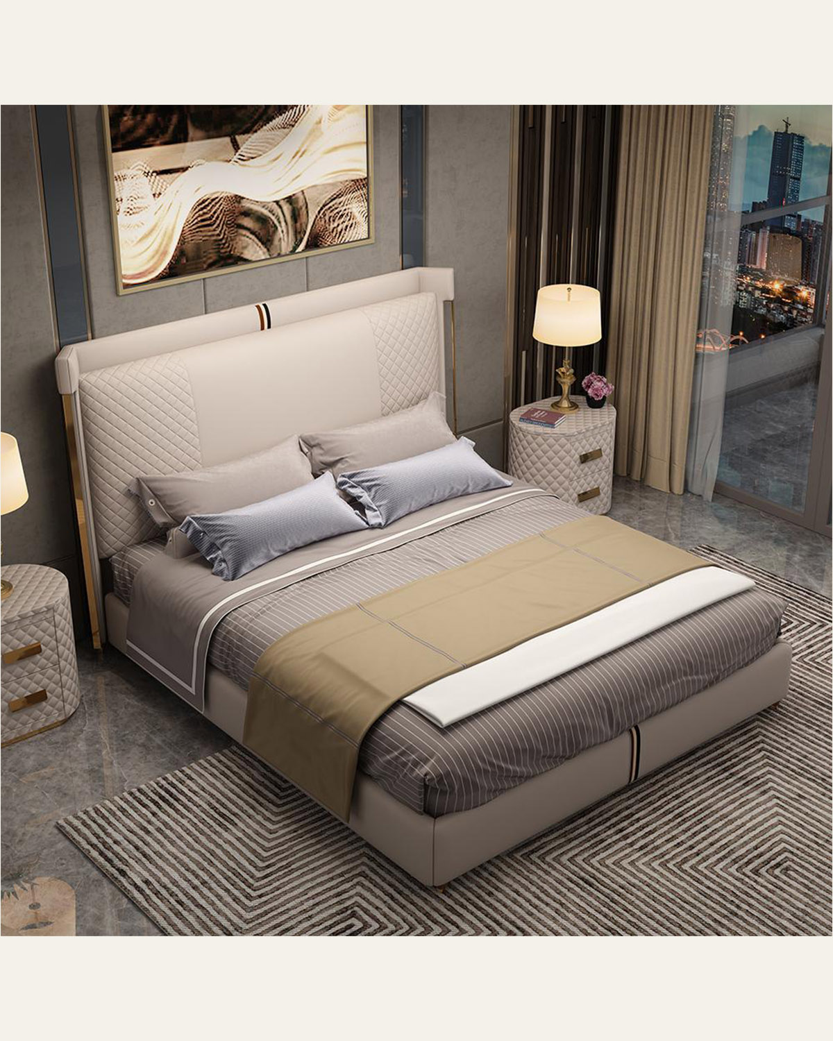 The refined manufacturing of the headboard, enriched with decorative studs, is the main feature of the Sharpei bed, an iconic piece of furniture which combines sartorial manufacturing with sophisticated decoration.